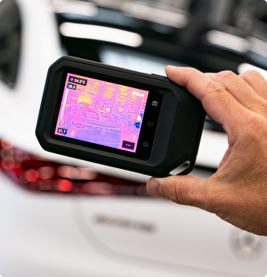 Au déchargement de la dépanneuse, le véhicule ayant subi un choc est pris en charge en concession par vos équipes de conseillers clients après-vente. Outil de prévention indispensable au diagnostic du véhicule accidenté, la caméra thermique Euro Red Diag va leur permettre de contrôler la température du pack batterie haute.